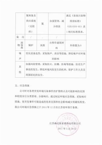 一、 基础信息 单位名称:江苏森达陈家港热电有限公司 组织机构代码:91320921757968929H 法人代表:闵长高 生产地址:江苏省盐城市响水县陈家港化工园区 联系方式:0515-86735902 所属行业:电力 主要产品: 电能 6577.64万千瓦时 热能 3095505吉焦 项目建设基本情况 江苏森达陈家港热电有限公司是江苏森达热电集团的子公司,现建有3台75t/h循环流化床锅炉+1台130t/h循环流化床锅炉,并配置两台B15-4.9/0.981-2背压式汽轮发电机组。其中,3×75t/h循环流化床锅炉+2×B15-4.9/0.981-2背压式汽轮发电机组,于2003年10月开工建设,2006年12月通过盐城市环境保护局组织的环境保护竣工验收;1台130t/h循环流化床锅炉2010年初正式投产,2012年07月通过了响水县环境保护局组织的环境保护竣工验收;2015年7月江苏森达陈家港热电有限公司对现有4台锅炉进行了脱硫脱硝除尘提标改造,并于2015年7月20日通过了响水县环保局组织的环境保护验收。现有4台锅炉实施提标改造工程后大气污染物排放浓度可满足《火电厂大气污染物排放标准》(13223-2011)中已建锅炉污染物排放限值要求。 三、排污信息 (一)废水:主要包括酸碱废水、制备锅炉用水的尾水、工业杂用水、生活污水、冷却塔排水。酸碱废水经中和处理后部分回用于煤场喷淋,部分外排;工业杂用水和生活污水经预处理后排入园区污水处理厂;制备锅炉用水的尾水和冷却塔排水通过清下水排口排放。 (二)废气:主要是锅炉烟气,经炉内喷钙+炉外喷熟石灰半干法脱硫、低氮燃烧及SNCR脱硝、布袋除尘器除尘后,通过100米高烟囱排放。 (三)噪声:主要包括锅炉排气(间歇)、引风机、送风机、发电机、汽轮机、增压风机及泵类等。通过合理布局、安装消声器、设置隔声罩等措施降低噪声对外环境的影响。 (四)固废:主要包括灰渣和废润滑油。灰渣与江苏灌河建材有限公司签订处置协议,废润滑油已与淮安市德开再生资源实业有限公司签订废油处置协议。 (五)无组织废气:主要为干煤棚、料场产生的粉尘;燃煤堆放在半封闭的煤棚内,煤棚及料场均安装有喷淋装置。